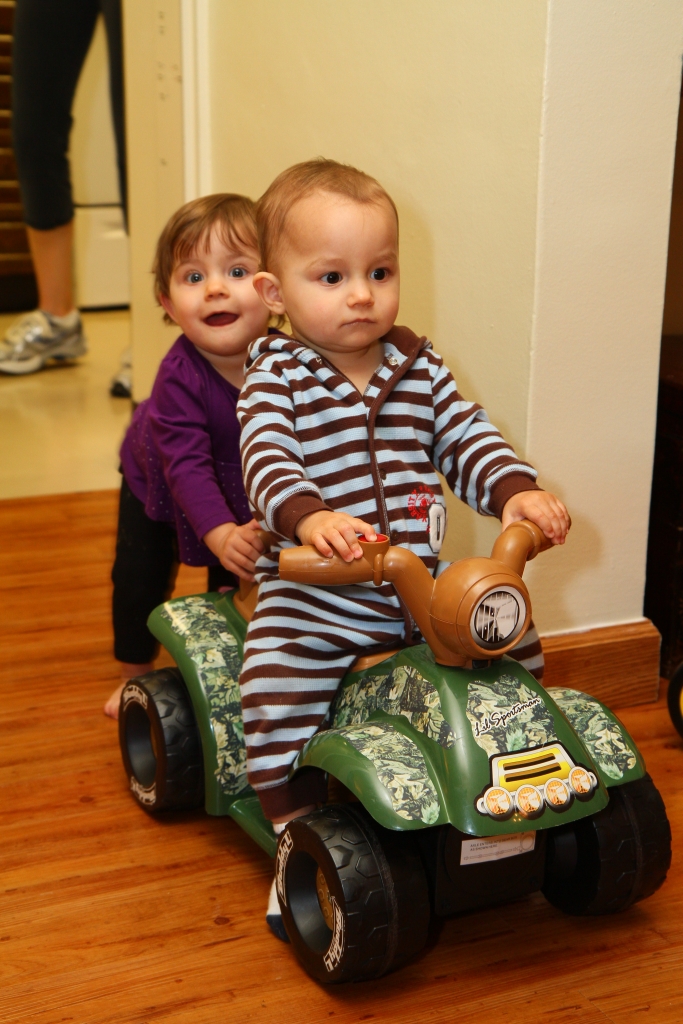 Audie still crawls most of the time, but today showed a renewed determination to walk more. He'll get up and take six or eight steps before he collapses and continues on crawling. He is still a little sweetheart, but is also becoming quite mischievous. He's quite sneaky, so sometimes it takes me a few minutes to realize he's gone...and that Adam has left the bathroom door open and the toilet seat up. There's Audie, elbow-deep in the toilet water. Or maybe I left my bathroom door open and he thought eye shadow was for eating. He's a curious little guy and we're no stranger to that around here. It's one more way he takes after his big brother, which I think is his primary goal. Audie loves Adam and just wants to be in his space. Who doesn't? I get it, Adam is a magnetic little dude. Audie eats well, but is slower than Anaya. He says "ball" and his own name and can also sign "more" and "all done," and has six teeth so far. He has a precious, innocent smile that makes you believe he didn't do it, even if there is purple eyeshadow all over his face or 150 sandwich baggies scattered across the floor. He's very serious and somber a lot of the time (see photo #2 below, where you would think he would be squealing with delight while being flown across the floor by Anaya). He also has a surprisingly short temper when it comes to anyone but Anaya. He's extremely patient with her, which is a blessing...because she is patient with no one. I guess twins are good like that.